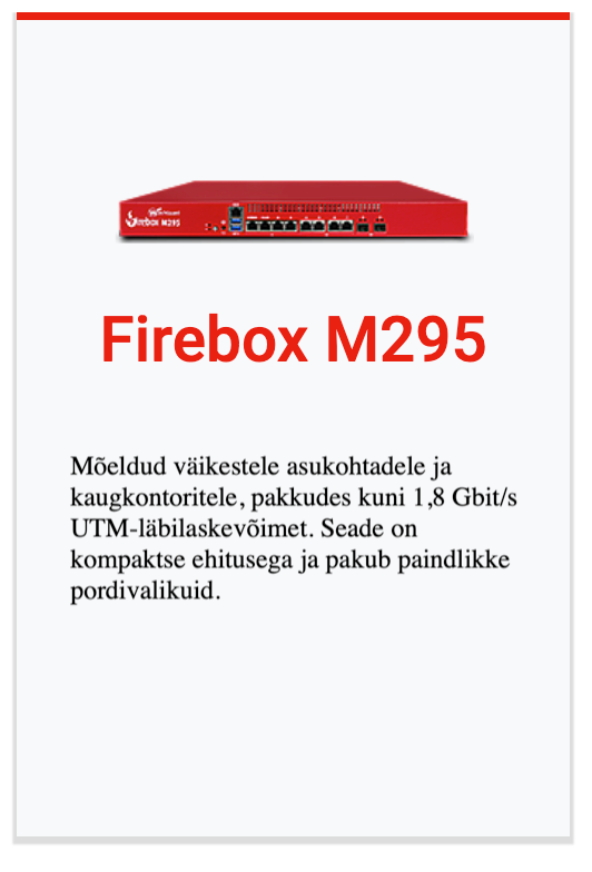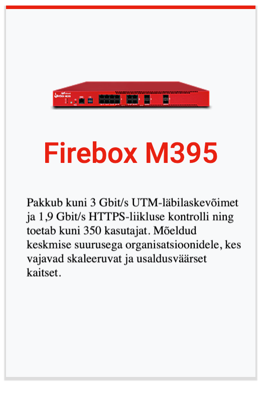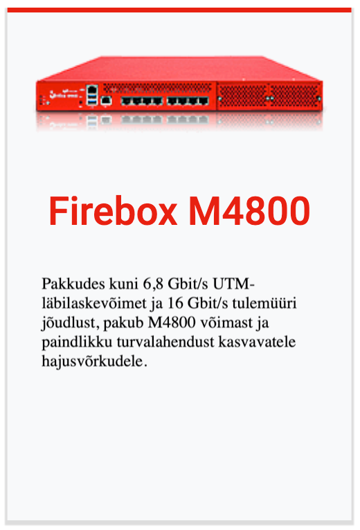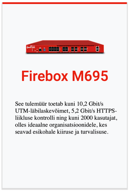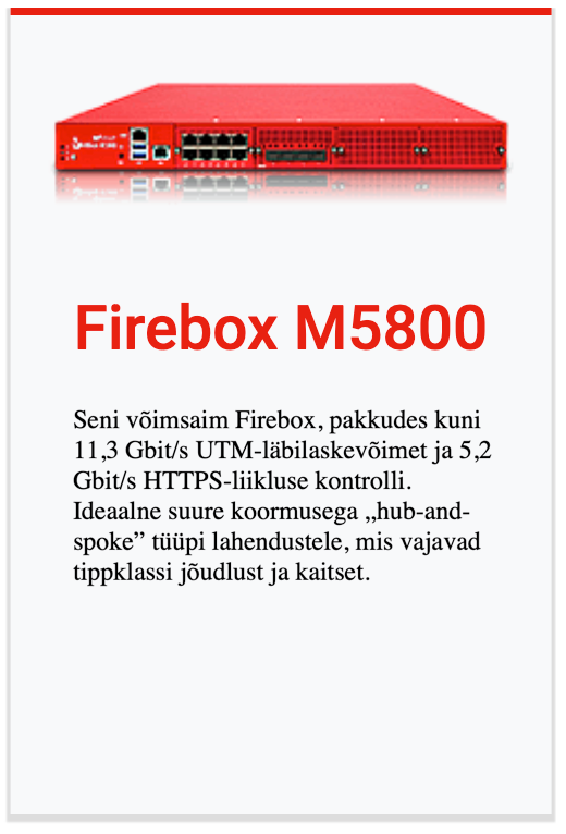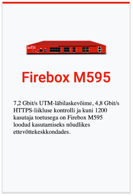 Kaasaegsete ärivajaduste jaoks loodud Firebox M-seeria rack-seadmed pakuvad järgmise põlvkonna tulemüüri (NGFW) funktsionaalsust kuni 5× kiirema ühe VPN-tunneli jõudluse ja 2–3× suurema UTM-läbilaskevõimega. Lihtsustatud litsentsimine eri teenuste lõikes annab ettevõtetele tervikliku turvakihi ilma peidetud kulude ja liigse keerukuseta. Need võimekad seadmed sobivad suurepäraselt harukontorite, hajusvõrkude ja suurte andmekeskuste kaitsmiseks.